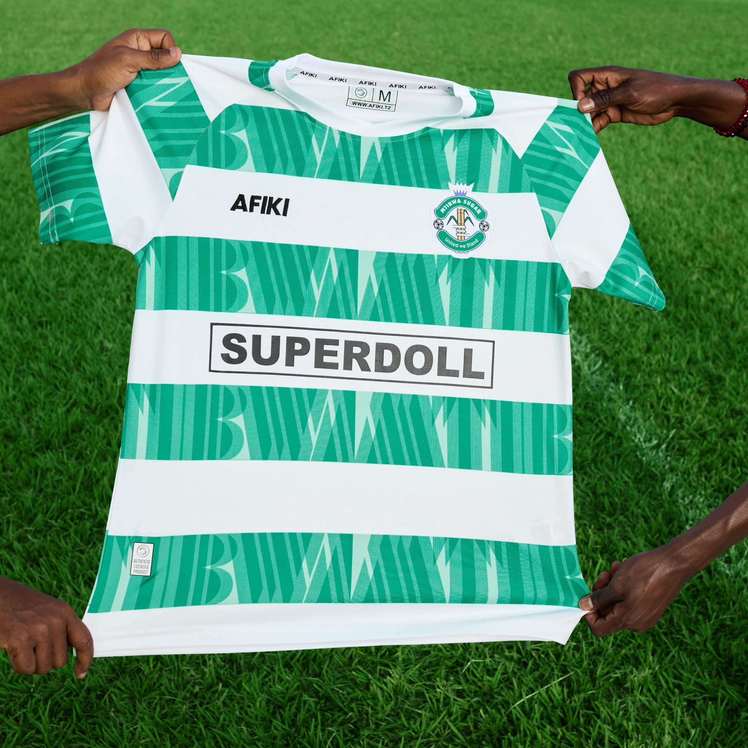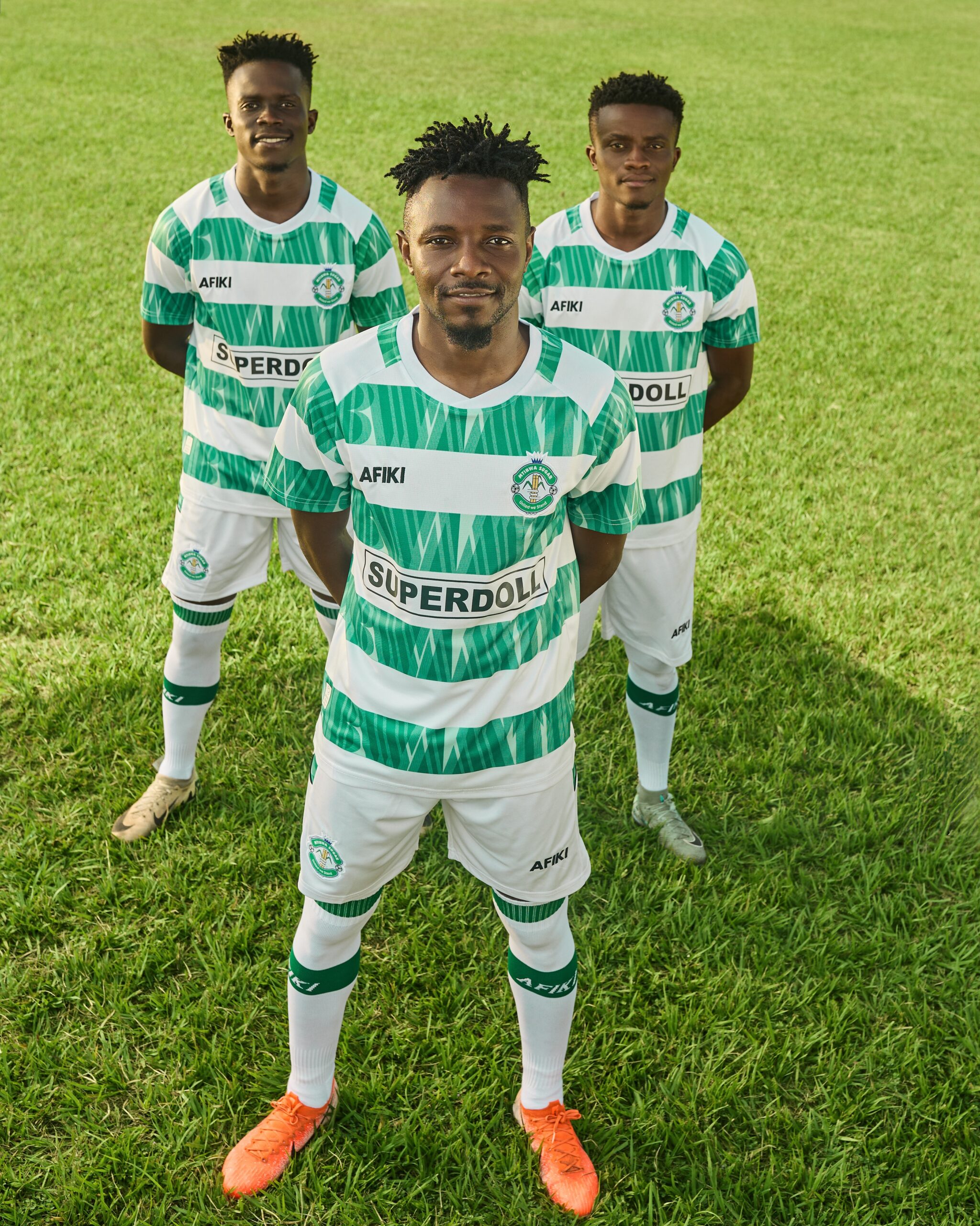 The home kit reinvents the iconic green-and-white stripes, shaping them into a subtle typographic pattern that quietly spells MTIBWA, a confident nod to the club’s return.